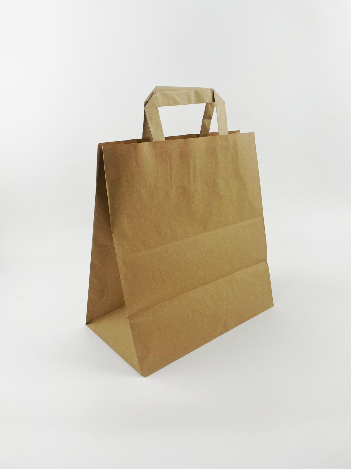 Pungile de hartie Kraft Natur cu maner plat sunt ideale pentru transportul produselor alimentelor pentru restaurante, fast food-uri, pizzerii, firme de catering, cafenele , sau magazine de tip take away.